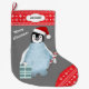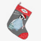 An adorable little penguin wears a red and white Santa hat and carries a striped candy cane on the front of this Christmas stocking. Beside him is a blue and white striped gift package, and the text in white that says "Merry Christmas". The image is placed on a medium grey background, and the toe and top border are a red and white snowflake pattern. On the top border is a white label with your custom text in matching grey. The back of the stocking has the same red and white snowflake pattern.