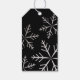 Modern, elegant holiday gift tags with falling silver snowflakes on a black tag.