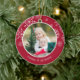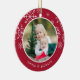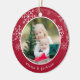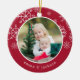 Festive photo Christmas ornament features a favourite photo on each side, framed by white snowflakes on vibrant cranberry red. Personalise with a custom caption on each side; shown with names and the year.