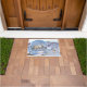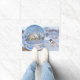 Inside a snow globe is a winter landscape with a cottage overshadowed by bare maple and cherry trees. Snow glitters on the lawn, holly bushes covered with bright red berries flank the door, and snowflakes tumble through the frozen air. Beside the globe a little chickadee looks curiously in at the miniature scene.