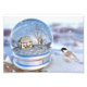 Inside a snow globe is a winter landscape with a cottage overshadowed by bare maple and cherry trees. Snow glitters on the lawn, holly bushes covered with bright red berries flank the door, and snowflakes tumble through the frozen air. Beside the globe a little chickadee looks curiously in at the miniature scene.