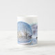 Inside a snow globe is a winter landscape with a cottage overshadowed by bare maple and cherry trees. Snow glitters on the lawn, holly bushes covered with bright red berries flank the door, and snowflakes tumble through the frozen air. Beside the globe a little chickadee looks curiously in at the miniature scene.