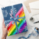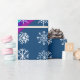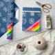 Very cool gift wrap in deep midnight blue covered in white snowflakes and with a streak of rainbow colours.