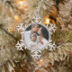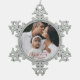 This pewter snowflake photo ornament is a beautifully crafted holiday keepsake, perfect for celebrating family memories. Shaped like a delicate snowflake, it has an elegant pewter finish that complements any Christmas decor. At the centre, a round frame holds your favourite family photo, encircled by intricate snowflake details. The words "Merry Christmas," along with your family name and the year, are printed in a crisp Christmas red, adding a joyful, personal touch. Designed to hang gracefully on your tree, this ornament will be cherished for years to come as a warm reminder of festive family moments.