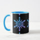 A pretty, diamond studded look mid century style snowflake. Purple and blue snowflakes on a black background.