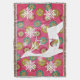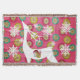 Colourful and pretty design features a hot pink background with colourful snowflake orbs, a white silhouette deer, and white snowflakes.