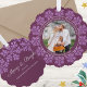 Personalised Christmas photo ornament cards are a festive way to send holiday greetings and this dark plum purple and faux glitter snowflake design is so easy to customise and make your own. Each ornament card has a hole punched at the top so your family and friends can hang your Christmas cards on their tree, the mantle or perhaps in a window. This elegant design begins with a circular border of tiny purple faux sparkle snowflakes around the edge with your personalised text and family photo in the centre. Two sets of curving white text can be edited to add your short Christmas greeting and names plus the year. Simply add your photo using the simple template and watch it turn into a round picture bordered in deep purple with a white edge. These personalised scallop shaped ornament cards reverse to reveal the same deep amethyst purple background with a sprinkle of larger faux glitter snowflakes at the top, Merry & Bright in the centre in a pretty white script font and smaller simpler text just below where you can add additional wording such as your individual names. Create your own custom Christmas photo ornament cards with this eye catching plum purple and bling snowflake design to delight everyone with Christmas cards they can hang and display for a little extra holiday cheer this year.