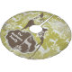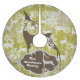 Snowflakes and Deer personalised holiday tree skirt features a vintage look mustard green background with lots of white deer and snowflakes, a big brown silhouette deer, a white silhouette deer on a brown and clay banner with an area you can easily personalise with your family name! This beautiful Snowflakes and Deer design holiday tree skirt makes a great gift or get one for yourself to enjoy for years to come!