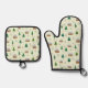 Oven mitts and pot holders with a pattern made of snowflakes, fir trees and small houses.