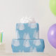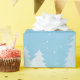 Pretty holiday or winter wrapping paper features lots of beautiful white snow covered trees and white snowflakes on a sky blue background.
