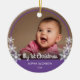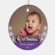 This keepsake Christmas ornament features a photo of baby and is framed with the colour purple and is accented with white snowflakes. White script text reads: My First Christmas. Custom text allows you to personalise with baby's name and year.