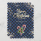 Blue plaid Christmas card featuring sparkling snowflakes, candy canes, holly and red berries on a blue buffalo plaid background.