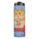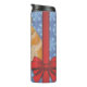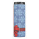 Cute Christmas Hamster design, perfect for the holiday season. This cute hamster is standing behind a red ribbon and bow, and there is a snowflake pattern. Background is blue.