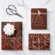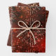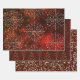 This elegant wrapping paper set features three flat sheets of burned red, and orange colour slightly distressed style of design. It features beautifully crafted snowflakes, Christmas trees, and Hearts. Each sheet has a different pattern but they have similar colours to complement each other.