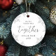 Personalised first Christmas together ornaments feature elegant trendy script and snowflakes in light grey, black and white, optional couple photo on the back, modern and simple.