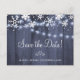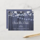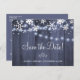 Wedding save the date postcard featuring rustic twinkle hanging lights, white snowflakes and three hearts on dark blue grey barn wood background. Ideal for your winter elegant rustic country | wonderland themed wedding.