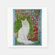 This is a gouache painting I made of a beautiful green-eyed white Turkish Angora cat Snowi. He loves to sit in the garden next to the ferns so I put those in the background. The frame has its inspiration from a Victorian floral frame, and there are impressions of a Moroccan window grille. There are beautiful red poppies in the foreground.