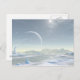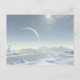 Illustration of an alien ice moon with a ring planet visible in the sky.