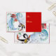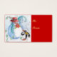 Whimsical,colourful original pastel painting in blue white red colours,snowman and penguin playing violin in winter snow with red flowers,flourishes.by Bulgan Lumini (c)