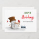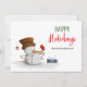 Adorable business holiday card with a winter illustration of a snowman listening to music and dancing. Illustrated and designed by Patricia Alvarez.