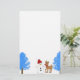 A cute scene with a little snowman and a reindeer and some frosty trees.
