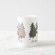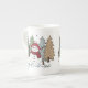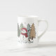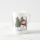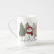 Enjoy your cup of tea in this beautiful bone china mug of a snowman in the Christmas trees, text is "Baby It's Cold Outside"