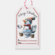 A whimsical Christmas tag showcases a cheerful snowman dressed in a cosy hat and scarf, playfully perched on a toilet, spreading holiday joy with a humourous twist.