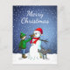 The boy has built a snowman that his dog stands and urinates on while the boy gives the snowman a carrot nose.