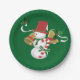 These cute snowman paper plates will please kids of all ages, and are appropriate for any holiday gathering. They feature an adorable snowman wearing a top hat and carrying a red and white striped candy cane which is tied with a pretty green bow. Behind him is a white ribbon with holly and two gold bells. The images are placed on a dark holiday green background. Cute! Be sure to see the matching paper napkins, cups, and other products in our store.