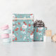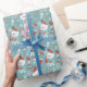 Cute cartoon snowman wrapping paper personalised with a kid's name or any custom text. Great gift wrap for Christmas or the Holidays, featuring winter illustrations and animals with a gender-neutral colour background in green tones.
