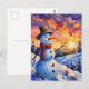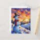 A detailed scene of a cheerful snowman standing proudly in a field, adorned with a cosy scarf and carrot nose, with a backdrop of a vibrant sunset casting warm, rosy glow across the snowy landscape. The rich palette blends warm oranges, deep reds, and soft purples in the sky, contrasting with the cool blues and crisp whites of the snow. Brushstrokes are expressive yet controlled, capturing the joy and unique character of the snowman.