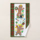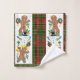 Christmas picture with gingerbread boy and girl between a happy snowman with stars, wreath and candy canes with a green red plaid tartan background.