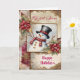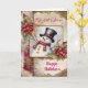 This holiday card features snowman in a black top hat, wearing a red scarf, as the main element on a junk journal page. Flowers, snowflakes, and gold filigree, with text, complete the page. Very beautiful and festive!