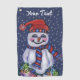 This golf towel has a happy snowman wearing a red and blue hat and scarf holding a bright lit string of Christmas lights with falling snowflakes on a dark blue background. Customise your text with the template.