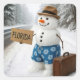 A hitchhiking snowman, wearing a straw hat and a swim trunks, holds a 'Florida' sign by the snowy roadside, while a nearby suitcase adds a whimsical travel theme to the winter scene