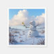 In a tranquil, snowy field, a snowman holds a daisy flower in one stick hand, while fluffy clouds drift across a brilliant blue sky, crafting a serene and picturesque scene that captures the essence of winter's beauty