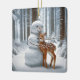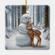 A whimsical scene in a snow-covered forest features a friendly snowman with a carrot nose and a young deer nuzzling against it.