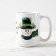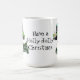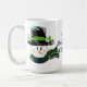 A cute faced snowman wearing a tall black hat with accents of stars, holly and a little bird. A scarf keeps him warm. The saying can be changed if so desired.