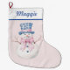 This Christmas stocking features grandmillennial design featuring a snowman in a blue and white Damask top hat on a blush pink background. You can personalise with a name in a navy blue cursive font.