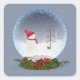 Snowman with gold Christmas star for old pine tree in a snow globe.