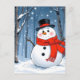 Snowman in cold forest with red scarf postcard