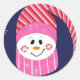 A sweet faced snowman in a fun pink, red and white striped hat and scarf.