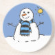 Christmas coaster. Cartoon illustration of a snowman on a sunny day. Xmas drinks mat.