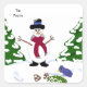 A cute winter scene with a cute snowman in the forest with trees, and a little blue bird checking out some pine cones and a branch.