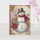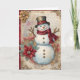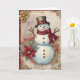 A happy snowman in a top hat and scarf is superimposed on a junk journal page comprised of flowers and leaves, papers, text, and little snow sprinkles on this charming holiday card.
