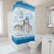 Here's a cheerful blue shower curtain with a cute holiday snowman and his buddy - a pup in a Santa suit - both in front of a decorated picket fence, enjoying the snow.