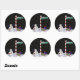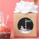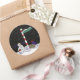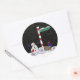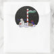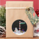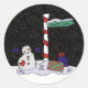 The snowman is dressed with blue gloves and buttons.  The snowman is standing next to a white and red pole with a green sign that says "North Pole". The gifts are next to the pole. White snow is laying on the ground.  The stickers are available with a white or black backround.
