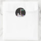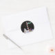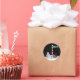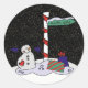 The snowman is dressed with blue gloves and buttons.  The snowman is standing next to a white and red pole with a green sign that says "North Pole". The gifts are next to the pole. White snow is laying on the ground.  The stickers are available with a white or black backround.