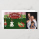 NOTE: The photo image is designed to be changed out for your family's Christmas portrait photograph. It's easy using the template field. COLOR PALETTE: deep forest hunter green, red, gold and white. DESIGN COLLECTION: This classic yet contemporary card was created from original art hand painted by Audrey Jeanne Roberts. Three hand painted ornaments are hanging from a traditional pine cone bough garland. One is a cute, whimsical Nutcracker, the second is a snowman who is all tangled up in a string of colored Christmas lights. The third is a Santa's Sled Sleigh filled with toys, presents and wrapped gifts. A red and white striped border at the top with an red oval with gold metallic border and the words "Merry Christmas from our family to yours" and your personalized family name completes the card.