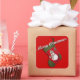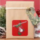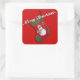 This Christmas sticker design features a photograph of a red and green stocking with an adorable snowman dressed with a seasonal plaid scarf and hat photograph set over a red background with white and gold Merry Christmas text.